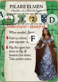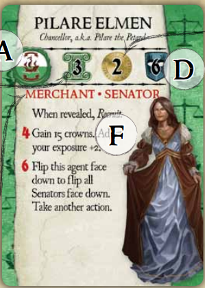 Durante esta fase cada sociedad revela a uno de sus agentes y se escoge un nuevo cabeza de turco. Los agentes son el corazón del juego y cada carta de agente contiene bastante información. Por un lado tenemos el sello que indica la facción a la que pertenece, la influencia que proporciona, los ingresos, la visibilidad, las profesiones y las habilidades especiales.