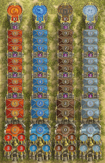 A la derecha podéis ver la escalera de culto. En la parte inferior hay 4 espacios donde podemos colocar nuestros sacerdotes uno de ellos nos permite avanzar 3 espacios mientras que los otros tres solo 2. Cada vez que cruzamos uno de las puertas obtenemos la cantidad de poder indicada.