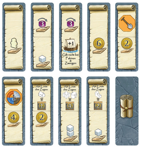 Al inicio del juego se escogen tantas cartas de bonus como jugadores + 3 y se colocan a la vista (imagen de la derecha). Durante cada turno cada jugador cogerá una de estas cartas de bonus para esa ronda. Luego la devolverá y la siguiente ronda los jugadores volverán a escoger la que más les convenga.